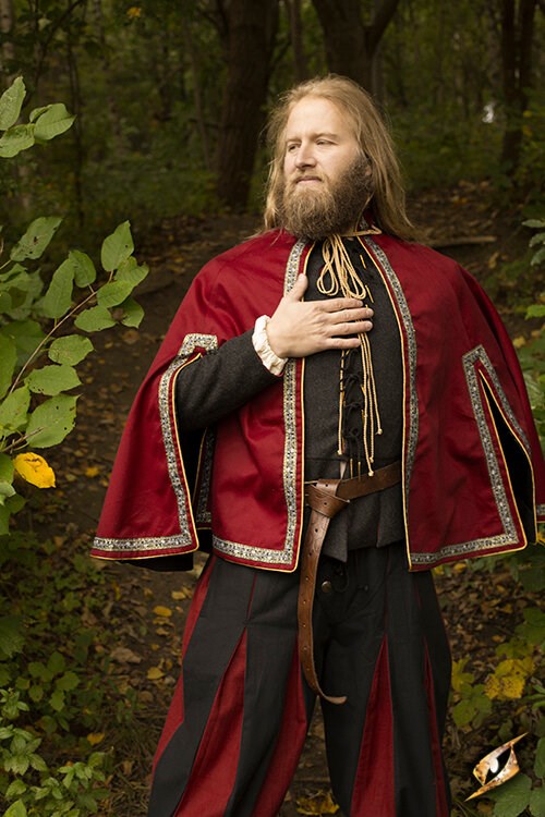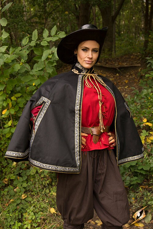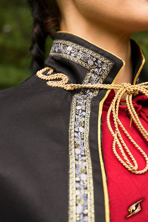 Epic Armoury’s Epic Black Cape Aramis is a hip-length caplet with a high collar and decorative cord fastening. The design is meant to offer a top layer of glamour that can be worn over one or both shoulders. Made from black cotton and cut to include extra billowing fabric, this cape is embellished with a detailed gold and black trim. Its fine appearance makes for a great accessory for a variety of Renaissance or fantasy costumes, especially nobility or musketeers.