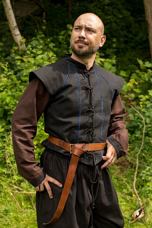 Epic Armoury’s Vest Tristan is a sleeveless shirt designed with bureaucrats or well-mannered townsfolk in mind. Reaching from the shoulders to the waist and made from soft, dyed cotton, this vest can be a costume all by itself--or work as a layer in a more complicated design. Designed to be form fitting and sleek, the vest features coloured trim meant to give you a slim and groomed appearance.